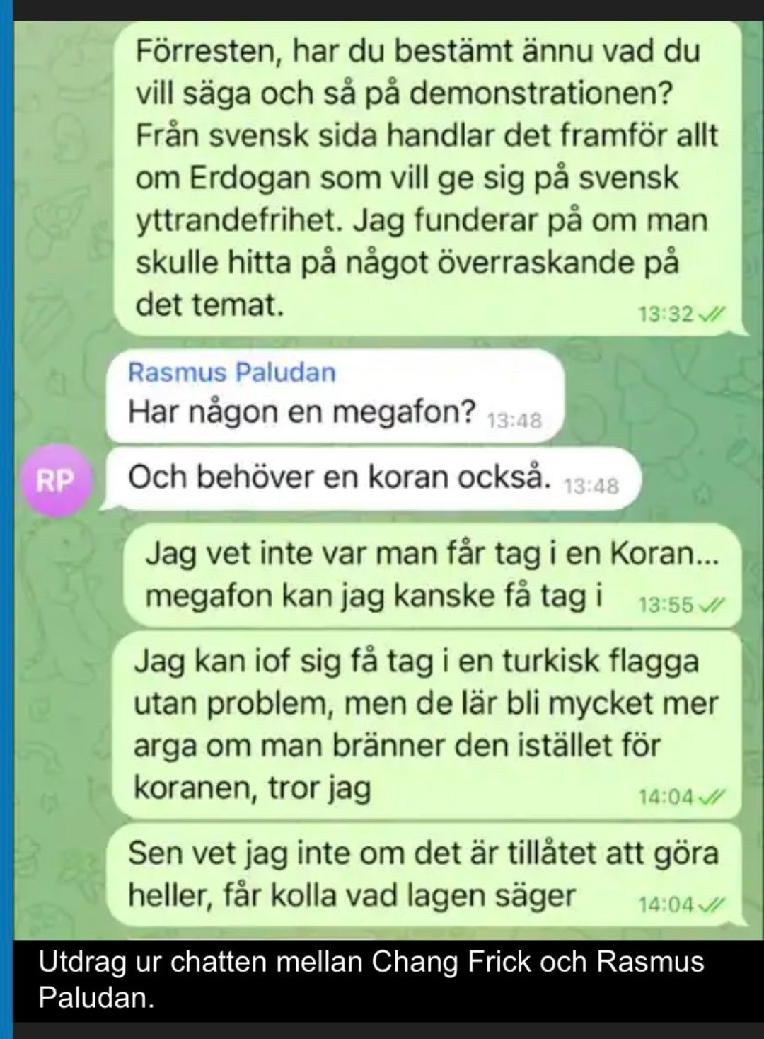 Chang Frick beskyller nu sin enda levande hjärncell för att vara den riktiga ansvariga för Paludans koranbränning. Samtidigt säger Paludan att det inte var hans idé, trots Fricks förnekande om att han deltagit i en chatt kring förberedelserna. Paludan har för övrigt ingen aning om vilka han pratat med, speciellt inte på chatten ”Teflon” (Telegram /reds anm).
